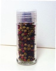 黒・白・緑・赤のペッパーを見た目に均等になるようミックス。透明なミルに入れて使うと綺麗で楽しいです。辛味と芳香も素晴らしいので、ぜひお試しあれ。